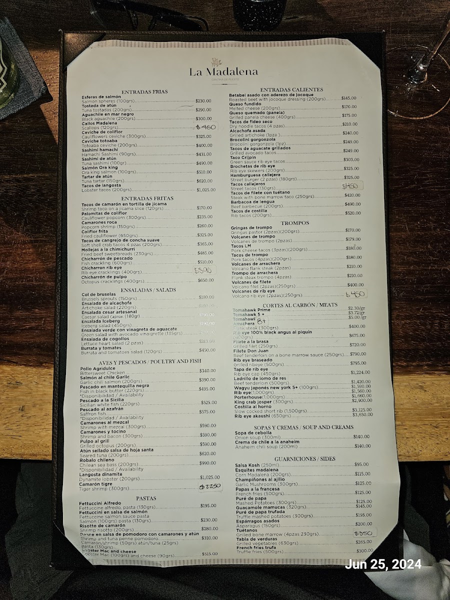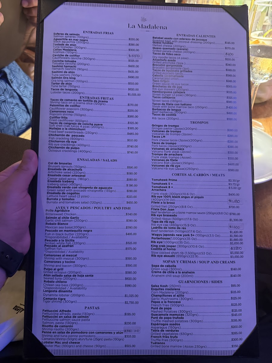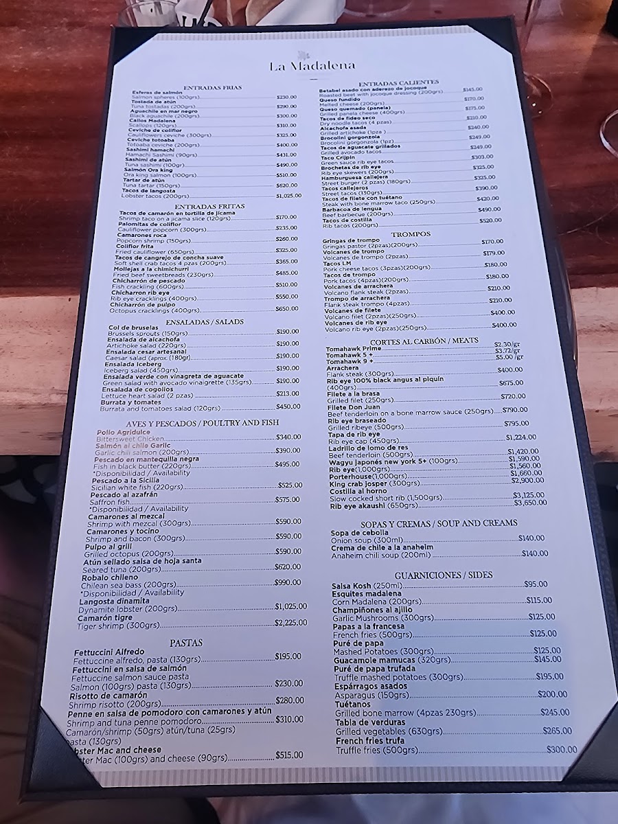 The menu offers a diverse selection of dishes primarily focused on Mexican cuisine and steakhouse specialties. Diners can expect a variety of steak cuts including Rib Eye, Tomahawk Steak, and Sliced Ribeye, complemented by seafood options such as Chilean Sea Bass, Soft Shell Crab Tacos, Lobster Tacos, and Tiger Shrimp. The menu also features pasta dishes like Fettuccine Alfredo and side items including Truffle Mashed Potatoes and Garlic Mushrooms. Traditional Mexican offerings such as table-made guacamole and Churros are available as well.
