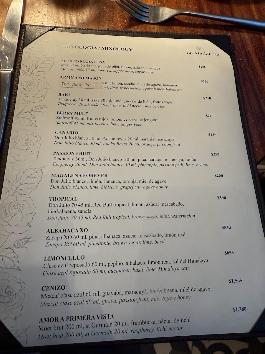 The menu is structured to accommodate both casual dining and more formal meals, suitable for lunch or dinner service. Beverage options include crafted cocktails prepared tableside, as noted in customer observations but not explicitly detailed here.